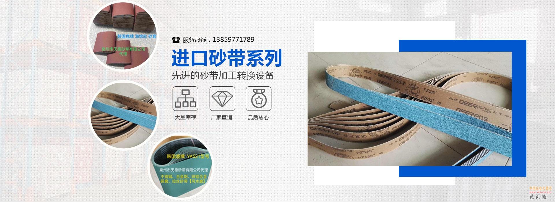 泉州天德砂带公司是一家专业的砂带转换加工企业,拥有国内先进的生产设备。主要经营韩国鹿牌、日本理研、以及国内外多种知名品牌的砂布带、砂纸带和多种异形产品,月产量近三万平方米。